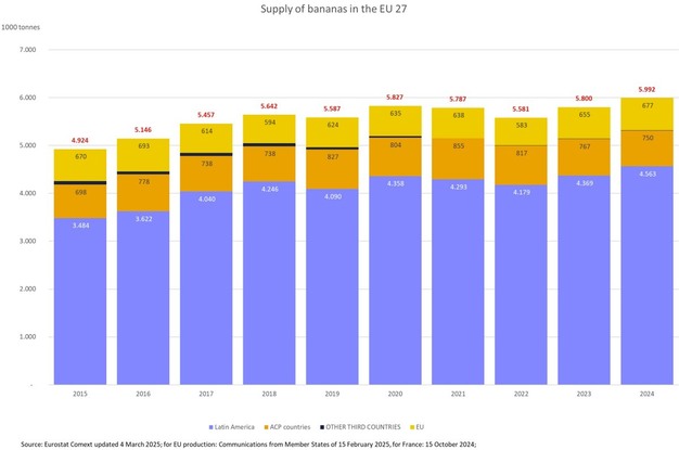 Voor het begin van 2026 wordt een bananenproductie van 196.752 ton in de EU verwacht, in vergelijking met 177.599 ton voor dezelfde periode in 2025. Spanje zal naar verwachting 126.000 ton bijdragen, Frankrijk 62.200 ton en Portugal 7.170 ton, wat een voortdurende jaarlijkse groei in de belangrijkste teeltregio's aangeeft.