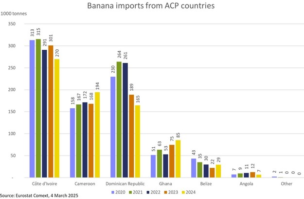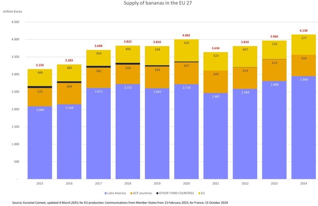 De totale bananenoogst van Portugal in 2025 bedroeg 25.897 ton. Hiervan werd 6.299 ton lokaal op de markt gebracht voor €0,95/kg, terwijl 19.598 ton werd afgezet buiten de teeltregio's voor €1,32/kg. In Cyprus werd 3.335 ton geoogst, verkocht voor €0,74/kg, terwijl Griekenland 757 ton leverde tegen €1,21/kg.