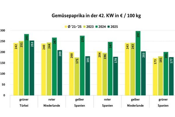 Het aanbod op de Duitse paprikamarkt bestond voornamelijk uit Nederlandse en Spaanse paprika's, aangevuld met vooral Turkse puntpaprika's. Poolse en Belgische zendingen completeerden het segment. In München hadden klanten nog toegang tot lokaal geteelde paprika's in alle drie de kleuren, terwijl in Frankfurt producten uit de Duitse regio Franken prijzen van 4 tot 5 euro per stuk konden behalen.