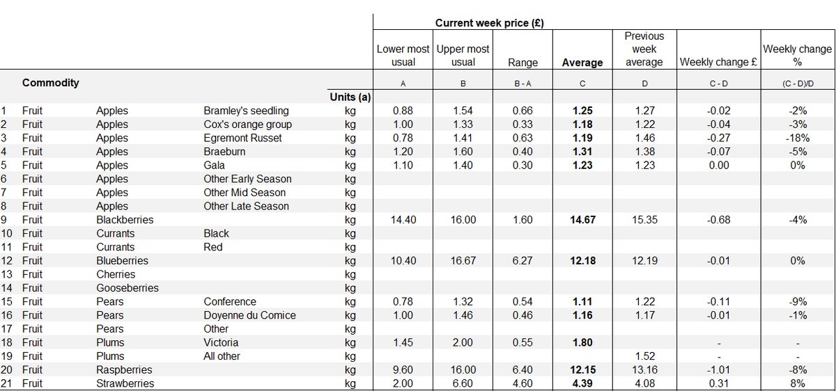 De prijzen voor diverse Britse appel- en perenrassen zijn deze week gedaald, terwijl de prijzen voor zachtfruit vrijwel stabiel is gebleven, volgens de meest recente marktgegevens.