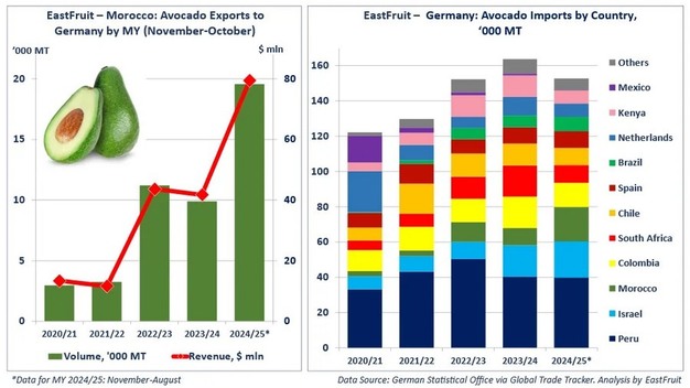 Avocado's zijn uitgegroeid tot een van de belangrijkste exportcategorieën van Marokko, en staan op de tweede plaats na mandarijnen in totaal volume. Duitsland blijft een van de top vijf bestemmingen voor Marokkaans fruit, en vertegenwoordigt meer dan 13% van de avocado-export van het land tijdens de eerste tien maanden van het verkoopseizoen 2024/25.