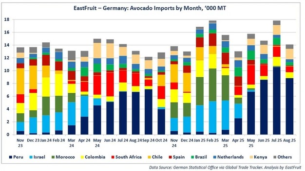Peru blijft de belangrijkste leverancier van avocado's aan Duitsland en domineert de leveringen tussen mei en oktober, terwijl Zuid-Afrika in dezelfde periode sterk concurreert. Chili voorziet de markt voornamelijk van november tot december, terwijl Israël, Colombia en Marokko essentieel zijn van januari tot maart.