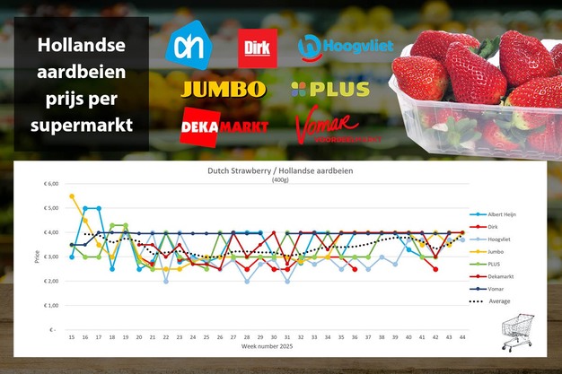 © Supermarktscanner.nlVoor de tweede week op rij bij Dirk en in week 44 ook bij Vomar ontbreken de aardbeien in het online schap. Vomar heeft de laagste prijs, 3,69 euro. De overige drie onderzochte supermarkten zetten de prijs op 3,99 euro. Gemiddeld komt de prijs op 3,93 euro.