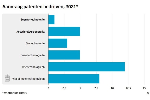 AI-bedrijven blijken ook innovatiever. In 2021 maakte 5 procent van de bedrijven die AI gebruikten deel uit van een ondernemingengroep die patenten aanvroeg, tegenover 1 procent van de bedrijven zonder AI. Voor bedrijven die drie AI-technologieën gebruiken, ligt dit aandeel nog hoger: 12 procent.