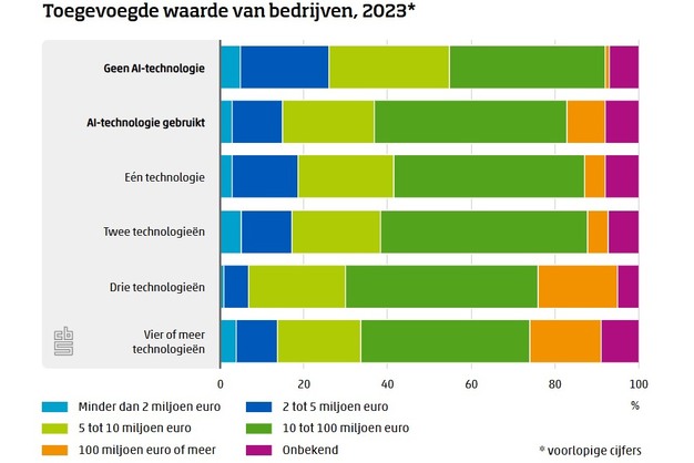Daarnaast hebben AI-bedrijven vaker een hogere toegevoegde waarde. Meer dan de helft van de bedrijven met AI heeft een toegevoegde waarde van minimaal 10 miljoen euro, tegen 39 procent bij bedrijven zonder AI. Negen procent van de AI-bedrijven zit boven de 100 miljoen euro, tegenover 1 procent van de niet-AI-gebruikers.