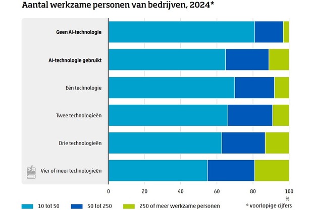 Van de bedrijven die in 2024 AI-technologie gebruikten, was 11 procent een grootbedrijf met 250 of meer werkzame personen. Nog eens bijna een kwart had tussen de 50 en 250 medewerkers. Bedrijven zonder AI zijn gemiddeld kleiner: 81 procent heeft 10 tot 50 werknemers, tegenover 65 procent bij de AI-gebruikers.