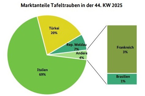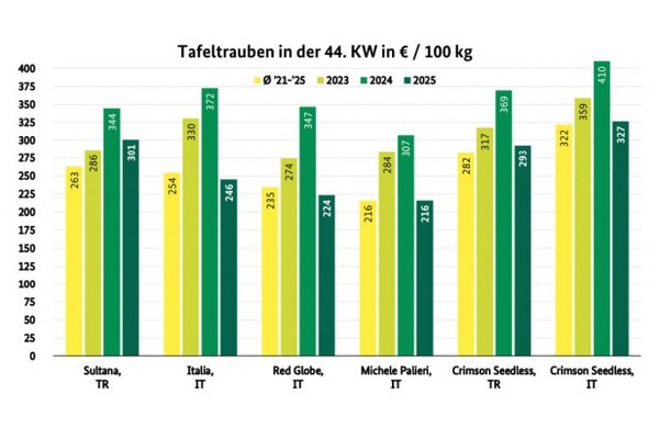Italiaanse druiven beheersten deze week de Duitse markt: er was een breed scala aan rassen beschikbaar, met Italia en Red Globe voorop, aangevuld door enkele Arra- en IFG-variëteiten. In Frankfurt was er een duidelijke verbetering in kwaliteit ten opzichte van de vorige week, wat leidde tot hogere prijzen. Consumenten in Hamburg moesten ook iets meer betalen. In München daalden de waarderingen voor Michele Palieri en Italia. Volgens BLE deed de Turkse Sultana het goed in Zuid-Duitsland, hoewel ze in Frankfurt niet volledig konden overtuigen op het gebied van de smaakkenmerken.