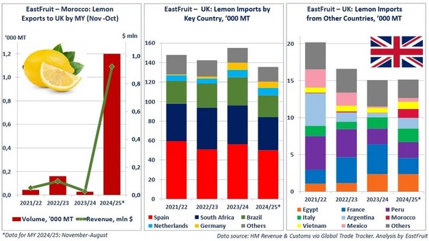 Analisten van EastFruit rapporteren een sterke toename in de export van Marokkaanse citroenen naar het Verenigd Koninkrijk tussen november 2024 en augustus 2025. Gedurende deze periode heeft Marokko 1.200 ton citroenen naar het VK verzonden, met een waarde van 791.200 euro. Dit geëxporteerde volume is 40 keer groter dan het in het vorige verkoopseizoen en overtreft de totale citroenexport van Marokko naar het VK van de afgelopen tien jaar.