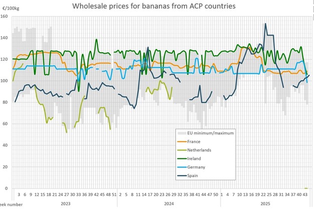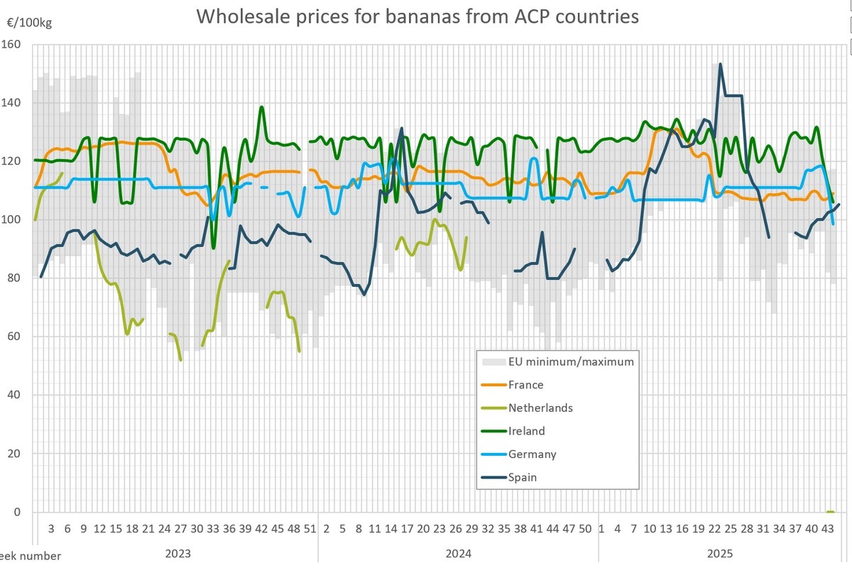 De gemiddelde groothandelsprijzen voor bananen in de EU lieten in week 45 lichte dalingen zien op verschillende markten vergeleken met week 44.