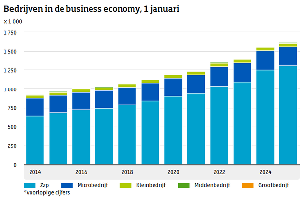 Aan het begin van 2025 telde Nederland ruim 1,6 miljoen mkb-bedrijven, bijna 75% meer dan in 2014. Deze groei komt vrijwel volledig door het stijgende aantal zzp'ers. Vooral in de verhuur en zakelijke dienstverlening, vervoer en opslag, en horeca groeide het aantal zelfstandigen hard.