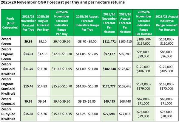 Zespri heeft zijn raming van november voor het kiwiseizoen 2025/26 gepubliceerd en meldt hogere opbrengstverwachtingen per tray voor alle fruitgroepen in vergelijking met de raming van augustus. De opbrengsten voor Green, Organic Green en Organic SunGold liggen inmiddels boven het hoogste niveau van de eerdere prognose. Op hectarebasis worden in alle categorieën recordopbrengsten verwacht.