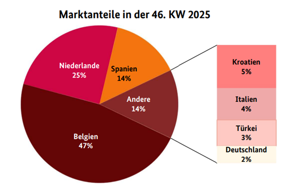 Volgens de Duitse BLE bleven Belgische en Nederlandse tomatenleveringen de markt domineren, maar zij verloren wel iets van hun marktaandeel. Spaanse aanvoeren namen opvallend toe, terwijl ook Marokkaanse en Turkse leveringen groeiden. Italiaanse en Kroatische partijen hadden vooral een aanvullende rol. Het aanbod vanuit Duitsland zelf maakte het geheel compleet.