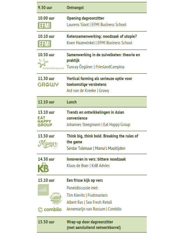 De versketen staat nooit stil. Consumenten stellen hogere eisen aan gemak, kwaliteit en duurzaamheid, terwijl technologische ontwikkelingen en samenwerkingsvormen de sector razendsnel veranderen. Hoe zorgen we dat de verscategorie ook in de toekomst relevant, aantrekkelijk en onderscheidend blijft? Tijdens het EFMI Nationale Verscongres 2025 op dinsdag 9 december op Kasteel De Vanenburg in Putten worden directies en senior managers uit de gehele foodketen samengebracht om vooruit te blikken naar een 'verse toekomst' met groei door samenwerking en innovatie.