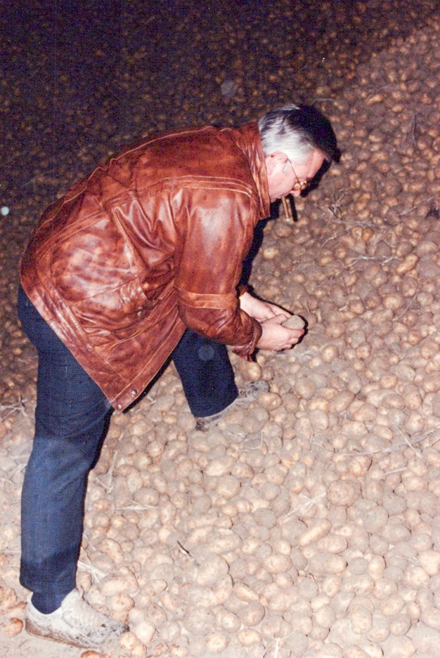 Foto rechts: De heer Jan Tuinstra keurt de aardappelen