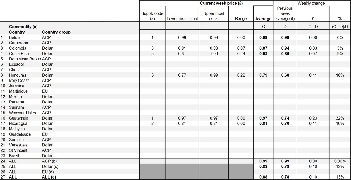 Honduras noteerde een scherpere aanpassing: het gemiddelde steeg van £0,68 naar £0,79 (€0,89) per kg, een toename van 16%.