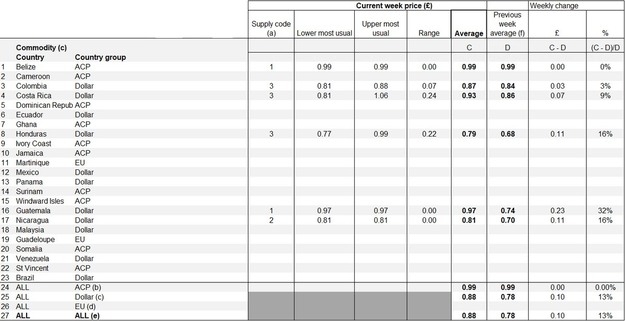 Belize was deze week het enige ACP-land met een prijsnotering. Het gemiddelde bleef stabiel op £0,99 per kg (€1,12), gelijk aan de voorgaande week. Voor Kameroen en de andere genoteerde ACP-leveranciers werden geen prijzen gerapporteerd.
