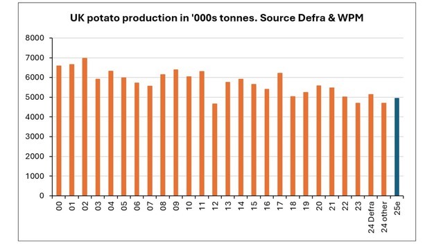 World Potato Markets voorspelt dat de aardappeloogst in het VK in 2025 uitkomt op 4,9 miljoen ton. Dit zou 300.000 ton onder het Defra-cijfer voor 2024 liggen, hoewel sectorbronnen stellen dat de echte productie vorig jaar dichter bij de 4,7 miljoen ton lag. Ondanks dat het slechts de zesde recordoogst in het VK is met minder dan vijf miljoen ton, lijkt het huidige volume toch voldoende om aan de marktvraag te voldoen.