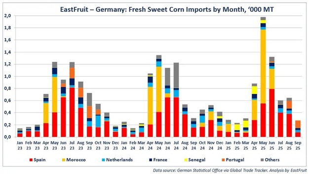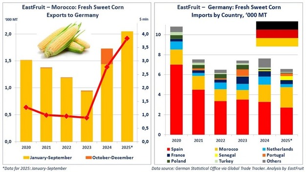 Marokko heeft voor het tweede achtereenvolgende jaar zijn uitvoer van verse zoete maïs naar Duitsland vergroot, aldus EastFruit.