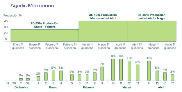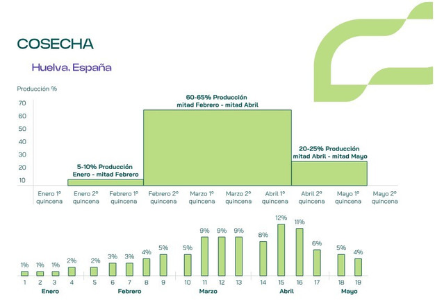 De bloemstructuur van Matías is ook gunstig. "De bloemen zijn goed verdeeld over de takken, zonder dichte trossen. Dat maakt het makkelijker om het juiste oogstmoment te bepalen en versnelt het plukken. De oogst kan gespreid worden over 10 tot 12 dagen, wat arbeidskosten verlaagt."