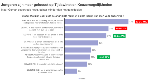 Volgens Suurmeijer zijn tijdwinst en keuzemogelijkheden voor deze groep de belangrijkste drijfveren. "Gemak is belangrijk voor iedereen en geen onderscheidende factor." Gezondheid speelt nauwelijks een rol; slechts een kleine groep noemt dit als reden om onderweg te eten. "Gezondheid? Nauwelijks relevant: slechts 8% van deze groep noemt het als reden."