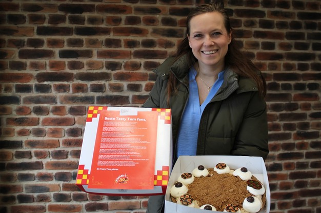 Met kaarsjes en kaartjes werd de AGF-redactie de afgelopen weken al warm gemaakt voor een taart, al bleef de afzender nog even onbekend. Maar vanmorgen kwam Ine van Kleef van Tasty Tom dan echt een Sinterklaas- en jubileumtaart bezorgen op de redactie. Nogmaals hartelijk dank! Het gedicht willen we jullie niet onthouden: