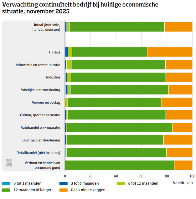 In totaal verwacht 4 procent van de bedrijven minder dan een jaar te kunnen voortbestaan bij de huidige economische omstandigheden. Bijna driekwart ziet de continuïteit langer dan een jaar veiliggesteld. De horeca blijkt het meest onzeker: 6 procent verwacht minder dan een jaar te overleven en 35 procent kan het nog niet zeggen. Andere sectoren, zoals verhuur en handel van onroerend goed, schatten hun continuïteit overwegend langer dan een jaar in (86 procent).