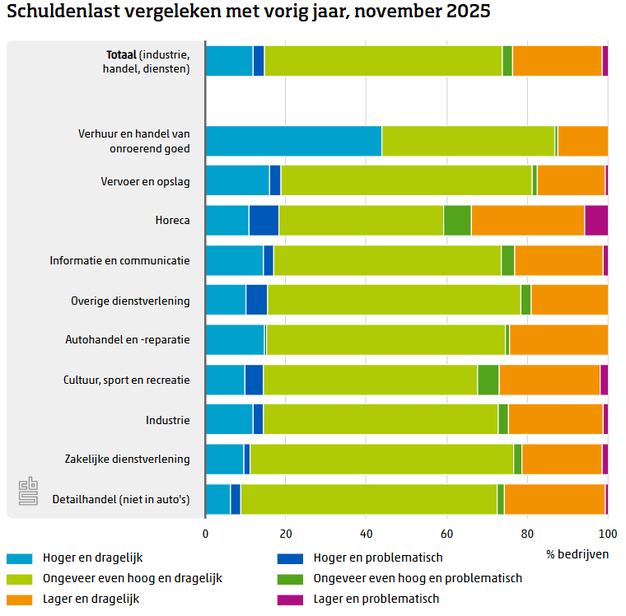 In de horecasector worstelt een op de vijf bedrijven met problematische schulden, tegen 14 procent in 2024. Ook in de sector informatie en communicatie is het aandeel bedrijven met een problematische schuldenlast gestegen, van 3,6 naar 6,9 procent. In andere sectoren zoals detailhandel, autohandel en overige dienstverlening is het aandeel juist gedaald. De laagste schuldenlast wordt gemeld in de verhuur en handel van onroerend goed (0,6 procent).