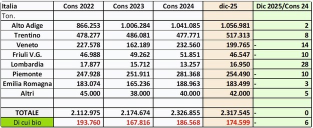 Regionale ontwikkelingen laten een gemengd beeld zien. Zuid-Tirol meldt een stijging van 2 procent ten opzichte van vorig jaar, naar 1.056.981 ton. Trentino noteert een plus van 8 procent tot 517.313 ton. Piemonte daalt met 10 procent, terwijl Veneto 14 procent minder produceert, deels door hagelschade. In Veneto wordt 43 procent van de oogst via speciale programma's toegewezen aan de industrie. Emilia-Romagna daalt met 3 procent, Friuli met 10 procent, terwijl Lombardije een stijging van 28 procent laat zien.