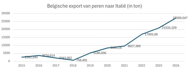 "De campagne in Italië is een EU-gefinancierd programma dat drie jaar loopt: 2025, 2026 en 2027. Het is heel bewust op Italië gericht, omdat we zien dat die markt bijzonder veel potentieel heeft. De Italiaanse consument kent peren goed en eet ze graag. Daardoor is het een ideale Europese afzetmarkt. De exportcijfers tonen ook een stevige stijging. In 2018 zaten we nog op 700 ton export richting Italië, terwijl we in 2024 afsloten met 27.000 ton. Dat is een enorme toename. En de eerste signalen zijn positief dat deze stijgende lijn doorzet."