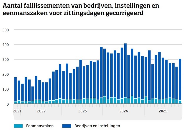 Tegelijkertijd daalde het aantal faillissementen in november 2025 fors. In totaal werden 307 bedrijven failliet verklaard, 13 procent minder dan in november 2024. Over de eerste elf maanden van 2025 ligt het aantal faillissementen 15 procent lager dan in dezelfde periode vorig jaar. Vergeleken met oktober 2025 nam het aantal faillissementen met 21 procent toe.