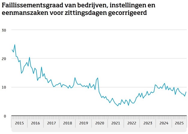 De faillissementsgraad, het aantal faillissementen per 100 duizend bedrijven, kwam in november uit op 8,3, tegen 9,7 een jaar eerder. De trend van de faillissementsgraad is sinds eind 2024 licht dalend.