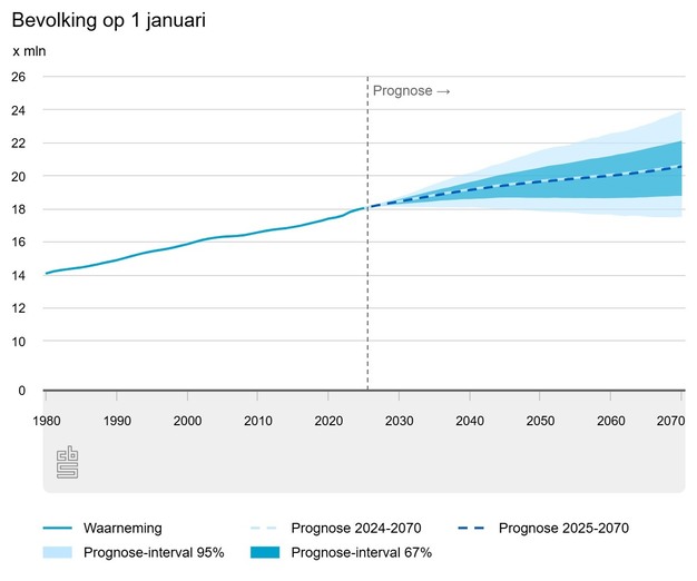 Het CBS stelt de bevolkingsprognose ieder jaar bij, en houdt daarbij rekening met de nieuwste ontwikkelingen en inzichten. Vergeleken met de prognose uit 2024 zijn er vooral aanpassingen op de korte termijn: hogere sterfte, lagere immigratie en hogere emigratie. Door deze bijstellingen komt het verwachte inwonertal in 2070 nu 70 duizend lager uit. Dit is een kleine bijstelling vergeleken met de onzekerheid rond de prognosecijfers.