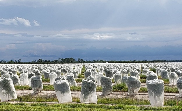 © CGC Bomen in Florida (VS) worden bedekt om aanvallen van de plaag Diaphorina citri te voorkomen. Foto met dank aan het onderzoekscentrum Ivia.