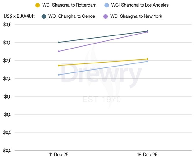 Volgens Drewry weerspiegelt de huidige trend een verschuiving in de seizoensgebonden vraag. Gegevens van de afgelopen drie jaar tonen een dubbelcijferige maand-op-maand groei van de vraag in december, wat hogere volumes aan het einde van het jaar ondersteunt. Bovendien melden luchtvaartmaatschappijen vroege boekingen in de aanloop naar het Lunar New Year in februari 2026. Op basis van deze ontwikkelingen verwacht Drewry dat de spottarieven de komende week verder bescheiden zullen stijgen.