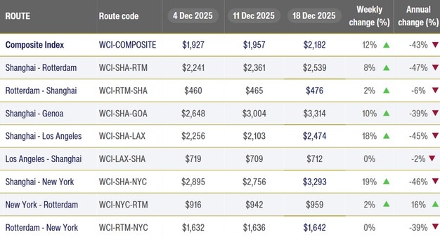 De Drewry World Container Index steeg deze week met 12% tot US$ 2.182 voor een 40-voets container, goed voor de derde wekelijkse stijging op rij. De stijging werd voornamelijk gedreven door hogere spotprijzen op de Transpacific en Azië-Europa handelsroutes.