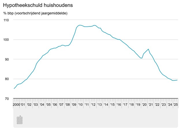 In het derde kwartaal van 2025 nam de woninghypotheekschuld toe met 12,7 miljard euro vergeleken met een kwartaal eerder. De hypotheekschuld loopt sterker op dan vorig jaar doordat de huizenprijzen in het derde kwartaal hoger lagen dan een jaar eerder en er meer woningen werden verkocht. De hypotheekschuld als percentage van het bbp was iets hoger dan in het vorige kwartaal, namelijk 79,3 procent in het derde kwartaal van 2025 ten opzichte van 79,2 procent een kwartaal eerder.
