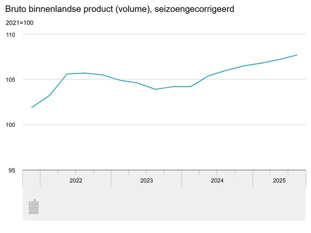 Volgens de tweede berekening van het CBS is het bruto binnenlands product (bbp) in het derde kwartaal van 2025 met 0,5 procent gestegen ten opzichte van het tweede kwartaal van 2025. Bij de eerste berekening, die is gepubliceerd op 30 oktober, kwam de groei uit op 0,4 procent. De tweede berekening van het bbp wordt ongeveer 85 dagen na afloop van het kwartaal gepubliceerd.