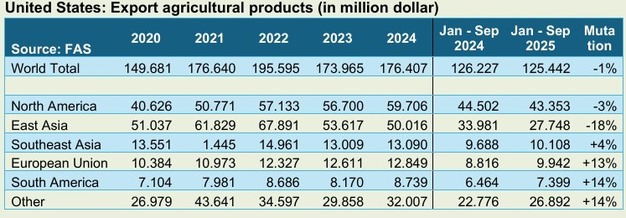 China was lange tijd op weg om een vergelijkbaar belangrijke afnemer te worden, maar in 2024 nam de export naar China al fors af, waarna deze in 2025 nog verder terugliep. Daartegenover staat een duidelijke groei van de Amerikaanse export van agrarische producten naar de Europese Unie en naar verschillende landen in Zuidoost-Azië.