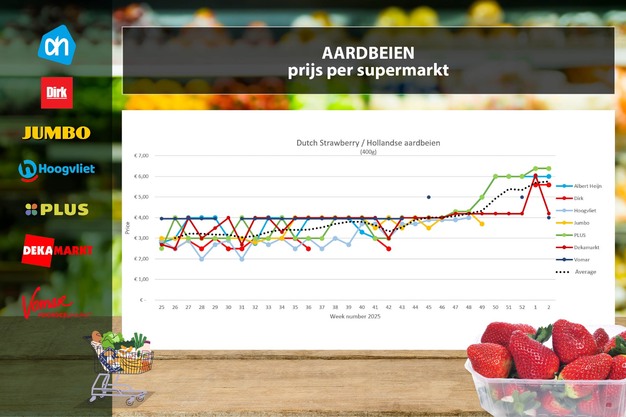Sinds week 1 van 2026 is het alleen Albert Heijn die (online) een 400g Hollandse aardbeien variant aanbiedt. De rest heeft deze al enkele weken niet meer, alleen soms nog een 250g variant. Voor de supermarkten die deze aanbieden hebben, worden deze nu omgerekend naar 400 gram. Het is dus geen zuivere vergelijking meer, maar een indicatie. DekaMarkt valt op met een prijsdaling van 1,87 euro ten opzichte van week 1.