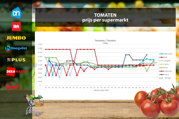 Vomar werkt online met vaste prijzen. Sinds 2022 ontbreekt avocado in het online assortiment; sinds week 24 geldt dat ook voor Galia. Jumbo verkoopt alleen verpakte trostomaten per 5 stuks in plaats van per 500 g of kilo. We rekenen met 100 gram per tomaat wanneer we een vergelijking maken.