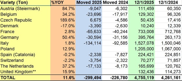 Spanje (Catalonië) bleef stabiel met 224.421 ton, licht lager dan 224.851 ton, terwijl Zwitserland 70.277 ton noteerde, iets minder dan 71.857 ton. Denemarken daalde naar 10.240 ton, van 12.339 ton. Nederland rapporteerde 165.699 ton, tegenover 120.762 ton vorig jaar, en het Verenigd Koninkrijk had 132.436 ton, tegenover 114.273 ton vorig seizoen.