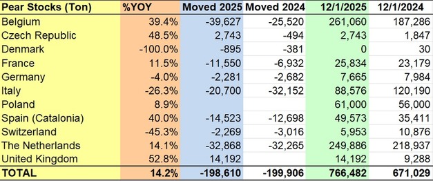 De totale Europese perenvoorraad bereikte 766.482 ton per 12 januari 2025, tegenover 671.029 ton een jaar eerder, een stijging van 14,2% j-o-j. Sinds het begin van het seizoen werd 198.610 ton afgezet, vergelijkbaar met 199.906 ton in 2024.