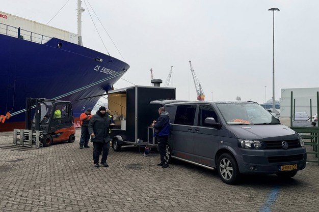Logistiek staat nooit stil! Zodat de kade weer vrij is voor het volgende schip. Ondanks de kou hebben de mannen dit weekend veel werk verzet. En even opwarmen: een lekker Brabants frietje van Friet van Ome Jan!