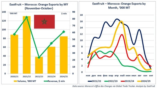 In het exportseizoen 2024/25 (november–oktober) voerde Marokko in totaal 84.600 ton sinaasappelen uit, met een exportwaarde van circa 52,4 mln euro. Het exportvolume lag daarmee 38% hoger dan in het voorgaande seizoen en meer dan tweemaal zo hoog als het dieptepunt dat in 2022/23 werd bereikt.