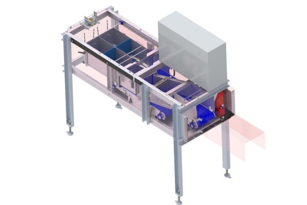 De ruimte onder de machine maakt een flexibele toevoer van kratten van voren of vanaf de zijkant mogelijk, wat een optimale systeemindeling ondersteunt. Bovendien zorgt het geïntegreerde dubbelopslagsysteem boven de vulpositie voor een continue werking met een capaciteit van maximaal 90 netten per minuut. Het open ontwerp van de machine garandeert daarnaast uitstekende toegankelijkheid voor zowel bediening als onderhoudspersoneel.