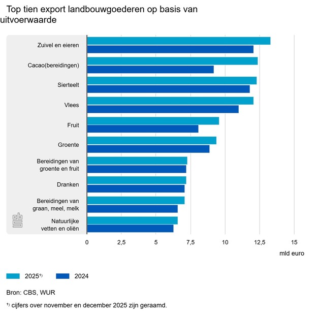 In 2025 heeft Nederland voor 137,5 miljard euro aan landbouwgoederen uitgevoerd. Dat is 8,4 procent meer dan het jaar ervoor. Onder andere de exportwaarde van cacaoproducten is fors gestegen. Dat melden Wageningen Social & Economic Research (WUR) en het Centraal Bureau voor de Statistiek (CBS) op basis van gezamenlijk onderzoek in opdracht van het ministerie van Landbouw, Visserij, Voedselzekerheid en Natuur (LVVN).