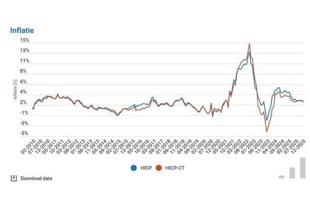 De Belgische inflatie volgens de Europees geharmoniseerde consumptieprijsindex (HICP) bedraagt 2,2% in december ten opzichte van 2,6% in november en 2,5% in oktober, meldt Statbel. De inflatie volgens de consumptieprijsindex (CPI) voor de maand december bedraagt 2,1% ten opzichte van 2,4% in november.