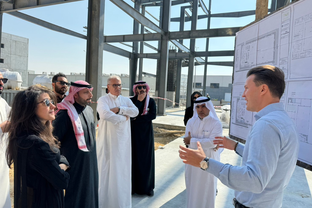 Jesper Hansen geeft een toelichting aan vertegenwoordigers van het Agricultural Development Fund van het Koninkrijk Saoedi-Arabië, financier van de joint venture, tijdens de vroege bouwfase van de farm
