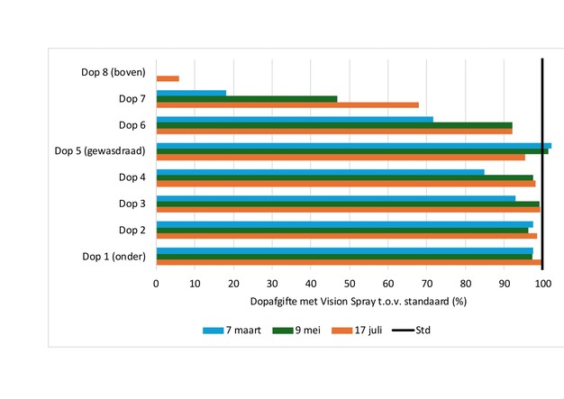 De effectiviteit van de bedekking werd gecontroleerd met watergevoelig papier en aanvullende testen met fluorescerend poeder. In mei en juli werden geen significante verschillen vastgesteld tussen beide spuitmethoden. In maart werden aanvankelijk verschillen waargenomen, die later werden toegeschreven aan instellingen van het detectiesysteem. Na softwareaanpassingen bleek ook in vroege stadia een vergelijkbare bedekking mogelijk, terwijl depositie op loze ruimtes zoals paden en draden duidelijk afnam.