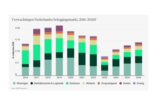 Het totale beleggingsvolume in Nederlands commercieel vastgoed kwam in 2025 uit op € 13 miljard, blijkt uit het Real Estate Market Outlook Report 2026 van CBRE Nederland, dat onderdeel is van de beursgenoteerde CBRE Group, 's werelds grootste vastgoedadviesbureau. Dit is een stijging van 15% ten opzichte van 2024 en komt voornamelijk voort uit beleggingen in woningen, kantoren en logistiek vastgoed, waarbij buitenlandse investeerders grotendeels afwezig bleven.